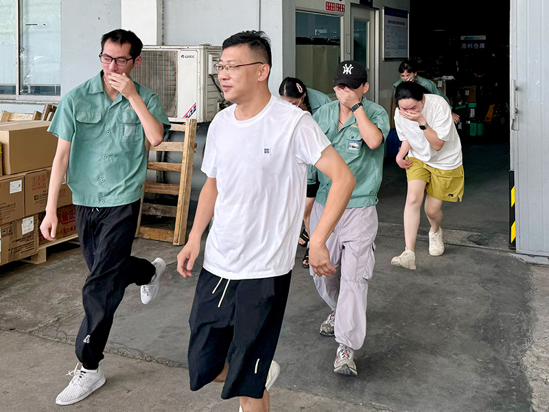 上午9时,随着安环部副部长马建栋一声清脆的口哨声,演习正式拉开序幕。各仓库负责人迅速响应,引导员工沿预定疏散路线有序撤离。大家严格遵循低姿弯腰、湿毛巾捂口鼻的规范姿势,快速向物流棚外主干道集结区移动。