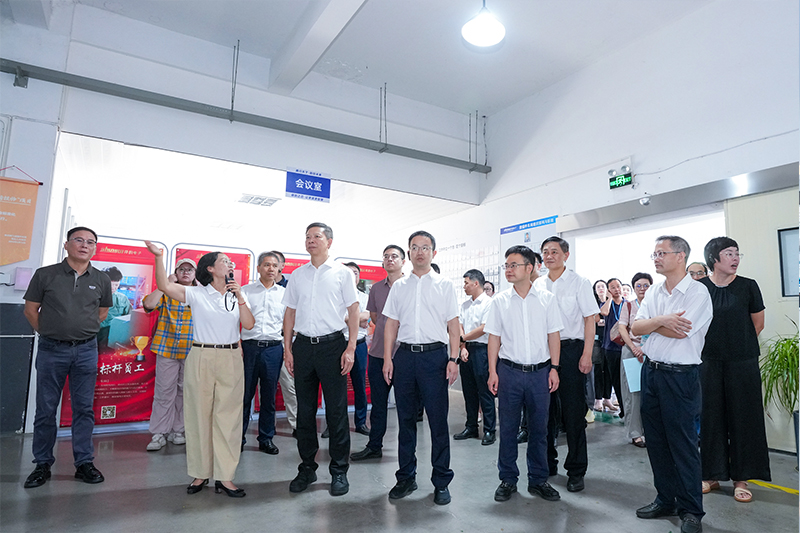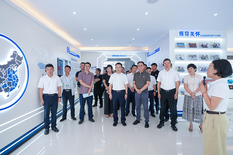 元成茂一行先后参观了企业展厅、共富工坊文化墙、共富车间、圆梦艺术团,通过实地考察,对舜韵电子的党建文化、企业文化,特别是对定向招工式共富工坊“1+3+N”工作法给予了高度肯定。