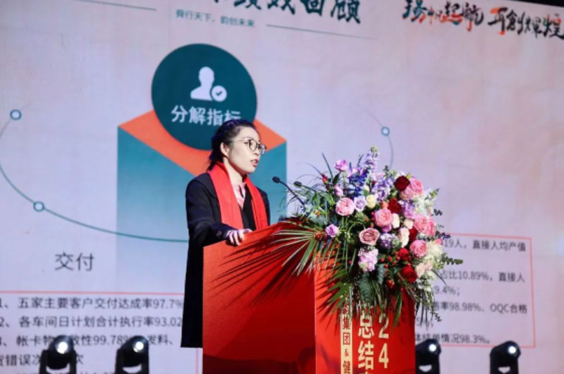 舜韵电子副总经理邵玲玲、健九鹤集团总经理戚勇分别作2024年度总结及2025年工作计划报告。邵玲玲从“绩效回顾、主要工作、存在不足、2024年工作计划”四方面作报告,她说“在经济形式不佳的当下,舜韵电子整体经营状况逆流而上,今年的销售金额同比数据跑赢行业水平,尤其是在10月至12月期间,全体员工克服压力,成功完成了艰巨的任务,”对于2025年提出的出库销售目标3.3亿,冲刺3.6亿,必须强化市场拓展和营销管理,激发技术创新与项目化执行,追求零缺陷,发展数字化智造,提升供应链整合能力,构建具有品质和价格竞争力的产品体系,实现组织能量的落地。