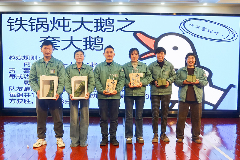 “铁锅炖大鹅之套大鹅”游戏让现场氛围再掀高潮!两人一组的搭档分工明确,戴鹅头帽的“大鹅”灵活移动躲避套圈,套圈的伙伴则瞄准目标、果断出手,10个套圈在2米外上演着“精准打击”。有的组合配合默契、百发百中,有的则状况百出、引得全场爆笑,无论是获胜的幸运组合拿下养生礼盒、香薰等大奖,还是参与的伙伴收获快乐,这份并肩作战的默契都成为了珍贵的回忆。