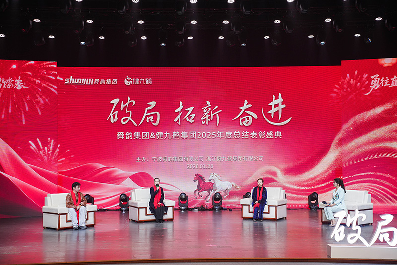 金鹏振翅开新局,万象更新启华章。1月28日,由舜韵集团与健九鹤集团联合主办、集团工会承办的2025年度总结表彰盛典,在泗门影剧院盛大启幕。两大集团800余名员工与特邀嘉宾齐聚一堂,回溯过往耕耘足迹,表彰先进榜样标杆,共绘2026发展蓝图。本次盛典以“破局·拓新·奋进”为核心主题,凝聚起同心同德、共赴新程的磅礴力量。